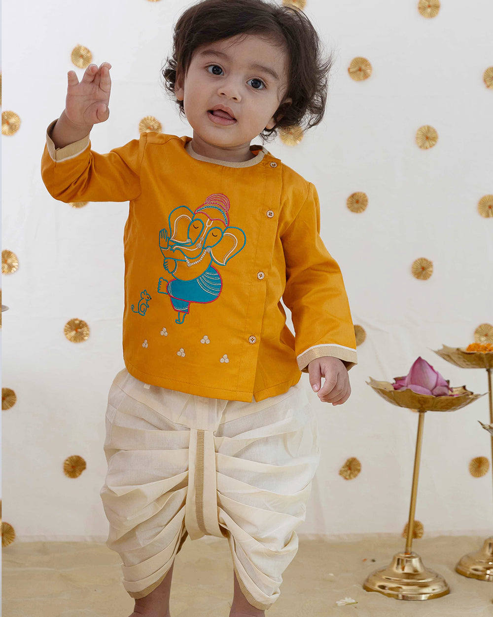 Tiber Taber Mustard & White Kurta Dhoti Set-Ganesha Embroidered-Cotton-For Infants