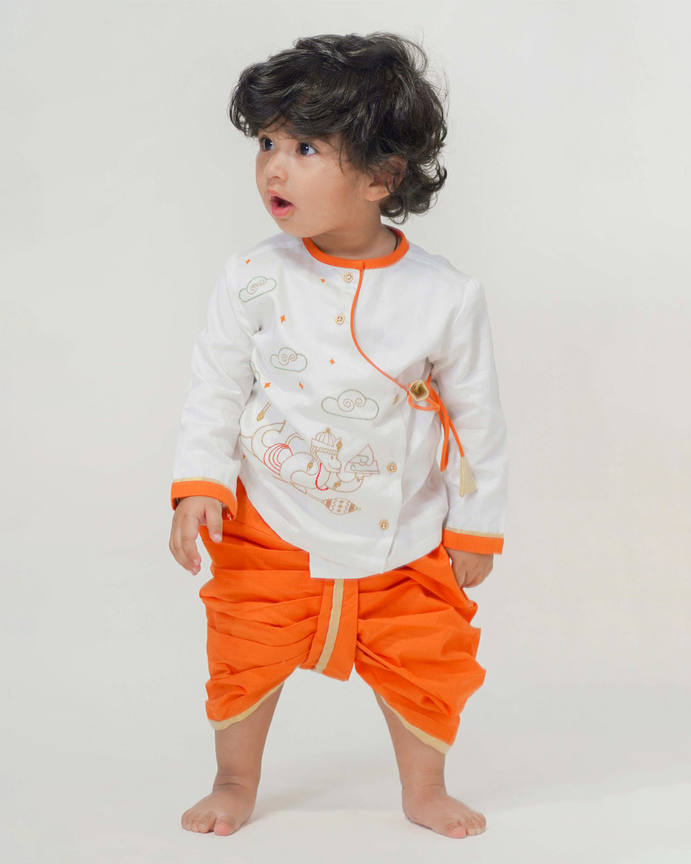 Tiber Taber Orange Kurta Dhoti Set-Hanuman Embroidered-Cotton-For Infants