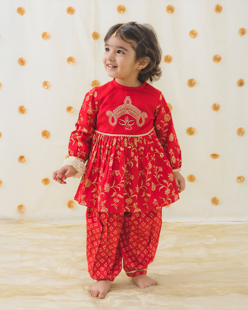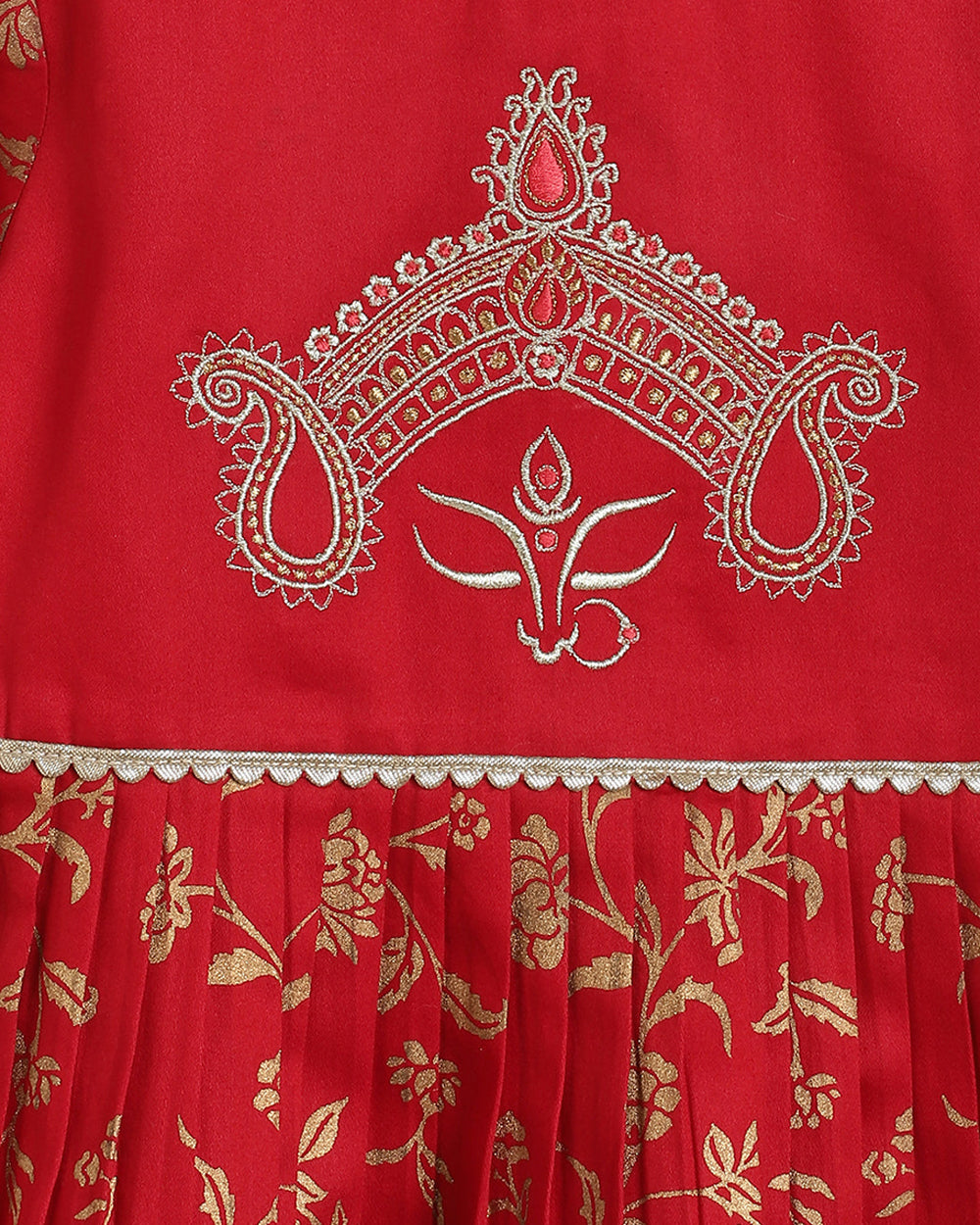Tiber Taber Red Angrakha Set-Devi Durga-Cotton-For Infants