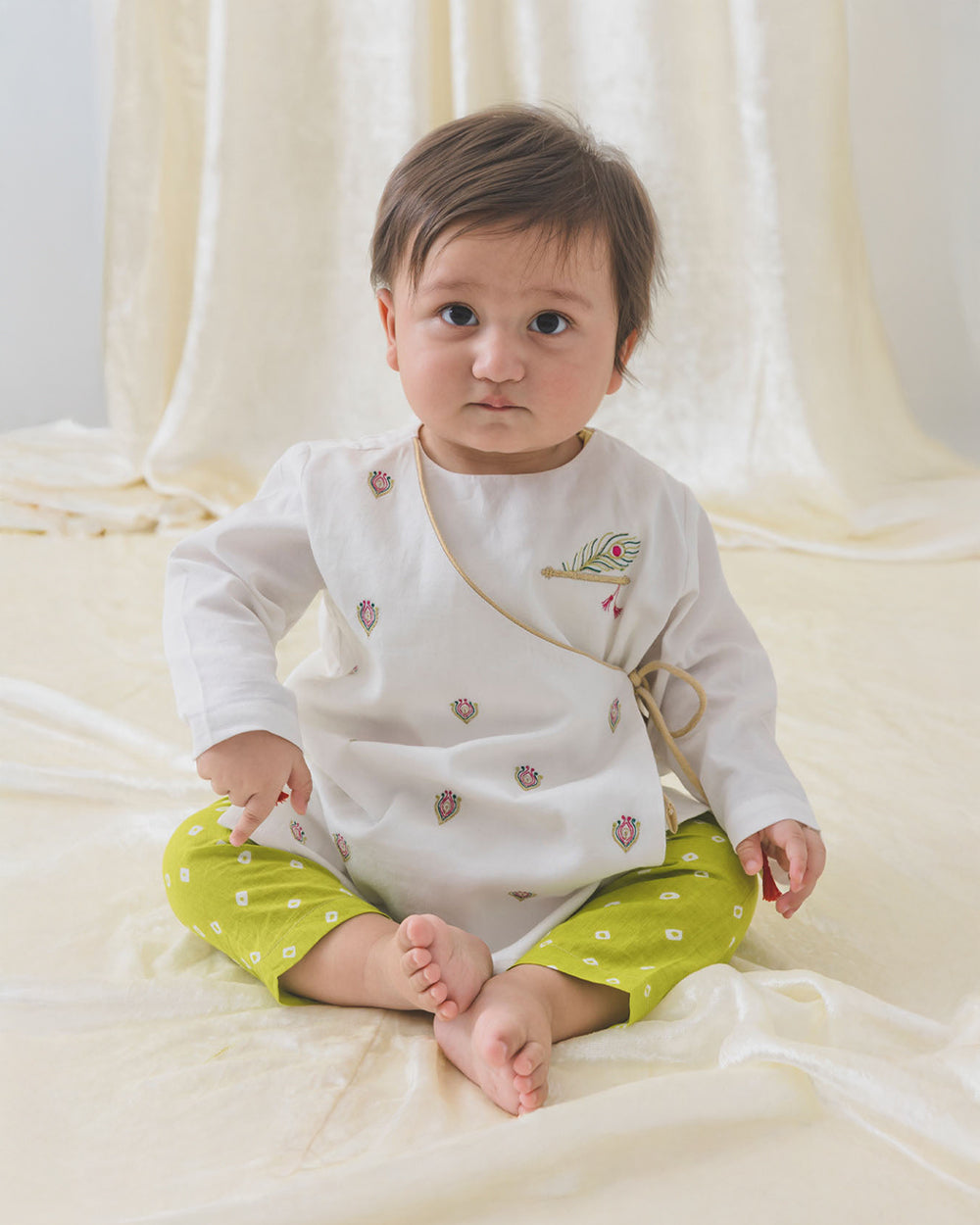 Tiber Taber White & Lime Angrakha Kurta Pajama Set-Embroidered-Cotton-For Infants