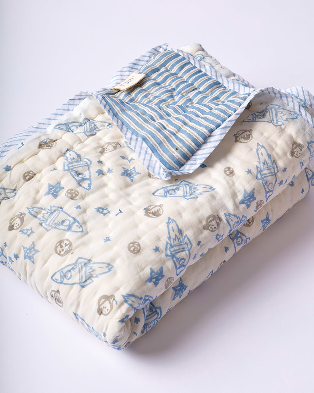 Torii Quilt for Baby-100% Cotton Muslin-Ultra Soft & Breathable-Cream & Blue-Rocket Star-0 to 24M
