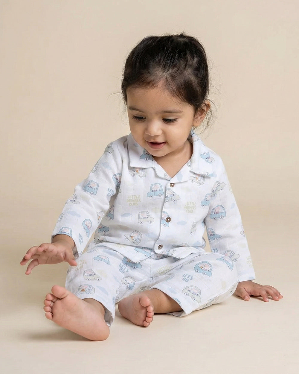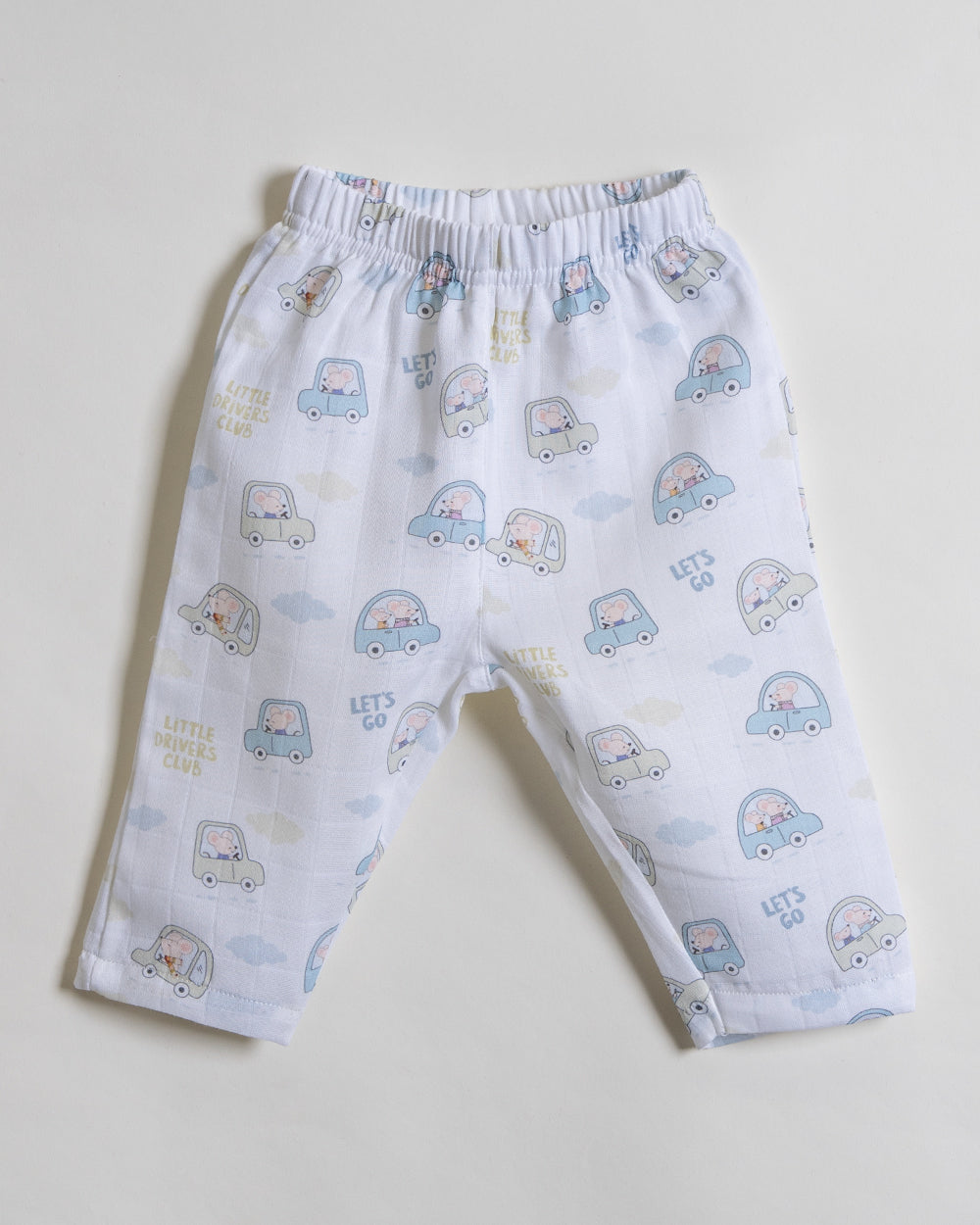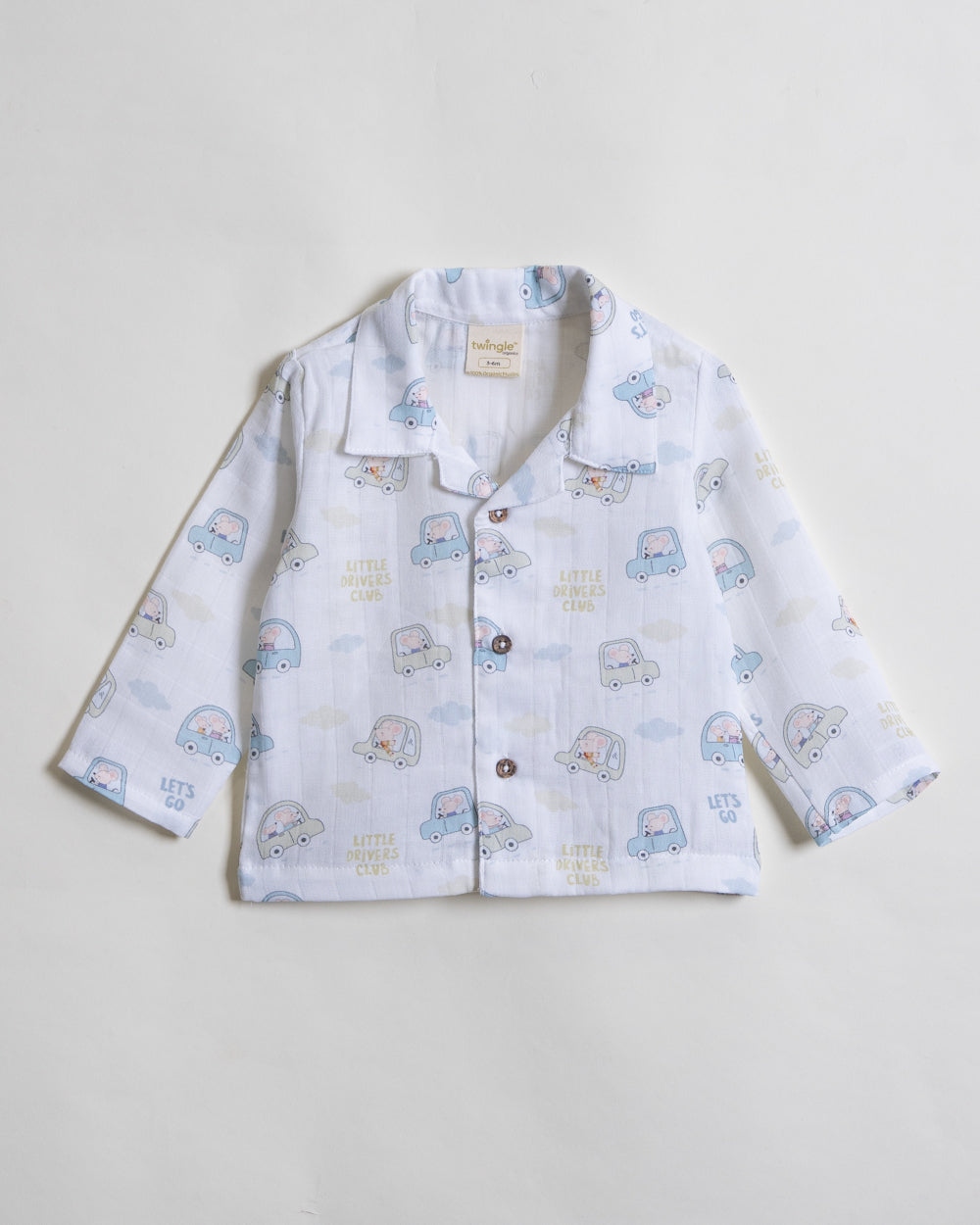 Twingle 100% Organic Muslin Nightsuit-Prevents Overheating-Naturally Temperature Regulating for Better Sleep-Soft Elasticated Waistband-Little Drivers-White-For Infants