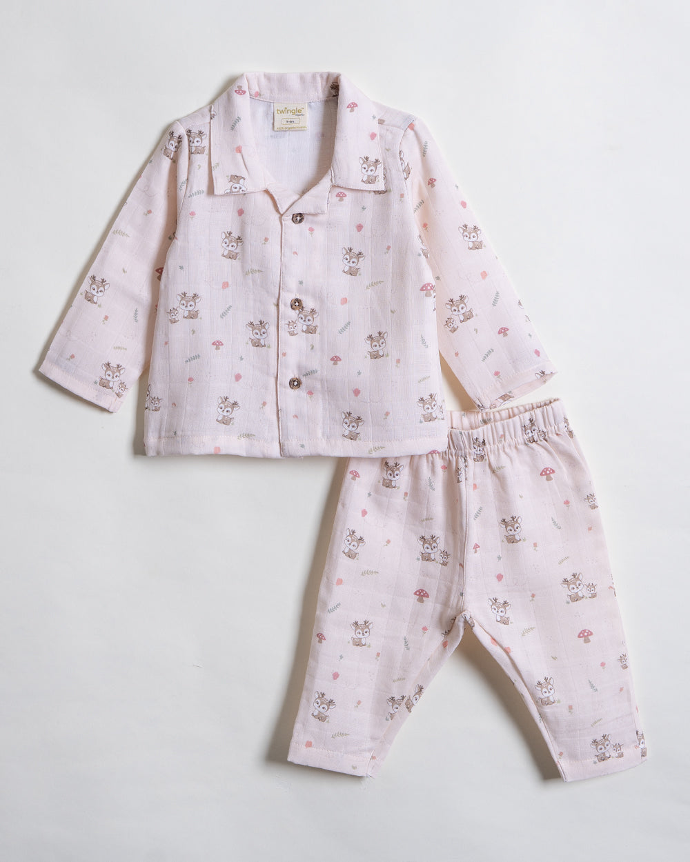 Twingle 100% Organic Muslin Nightsuit-Prevents Overheating-Naturally Temperature Regulating for Better Sleep-Soft Elasticated Waistband-Mama Deer-White-For Infants