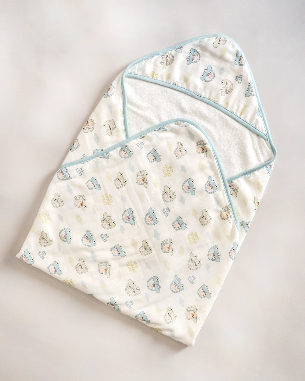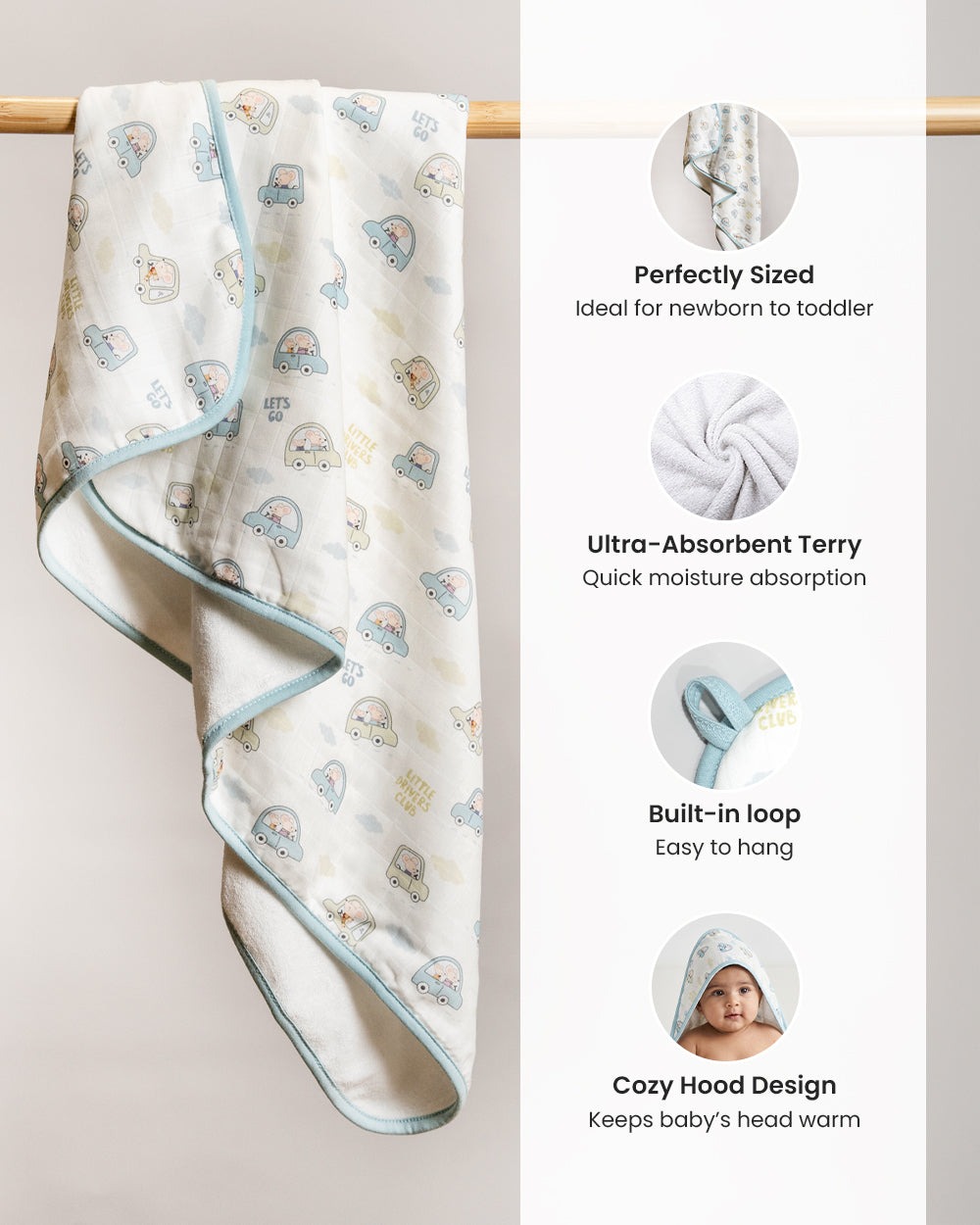 Twingle 100% Organic Muslin Baby Hooded Towel-Prevent Post Bath Chills-Ideal Coverage for Babies-Absorbs Moisture Quickly without Harsh Rubbing-Softens with Every Wash-Little Drivers-White-For Infants