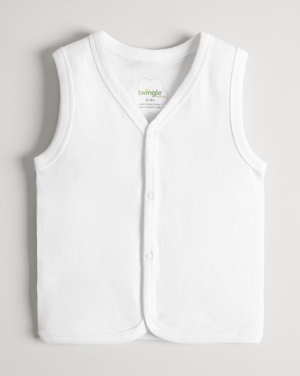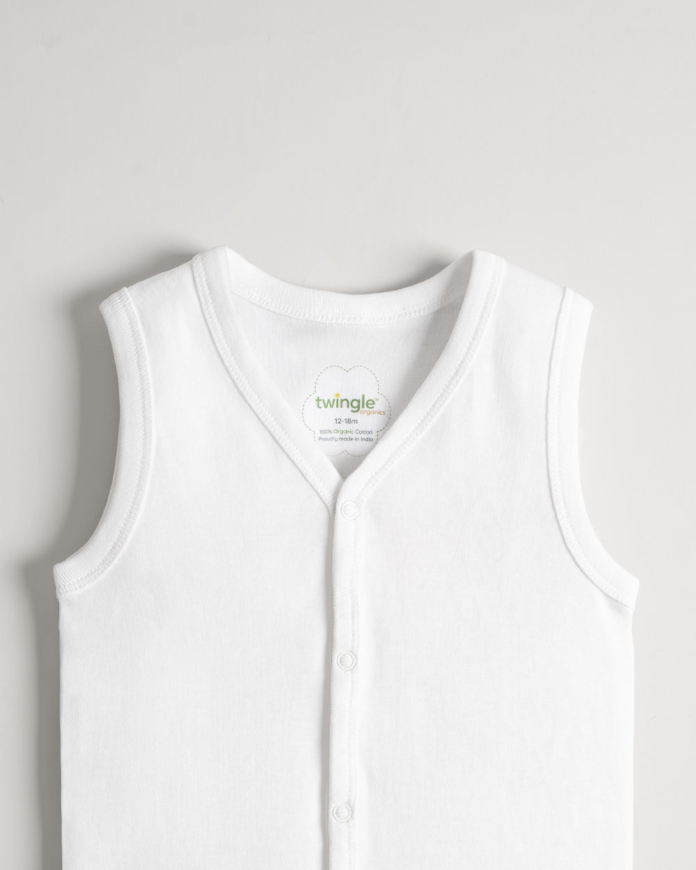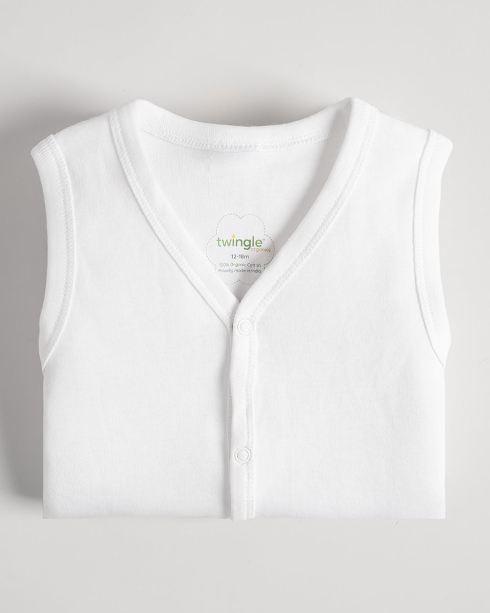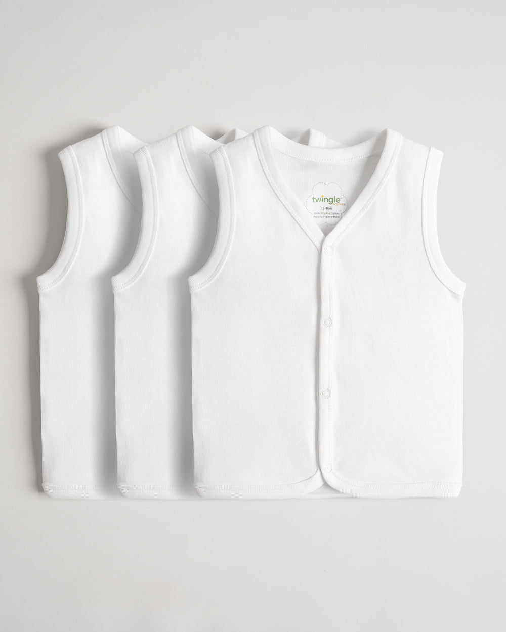 Twingle Snow White Front Open Sleeveless Jhabla Vest-Solid-100% Organic Cotton-Pack of 3-For Infants